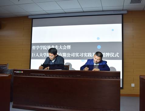 仪式上,巨人教育公司副总裁田本林和学院副院长李佃来分别代表合作双方签订了合作协议,李佃来副院长代表学院向巨人大学城教育培训有限公司授予“奈飞 教学实习与社会实践基地”牌匾。