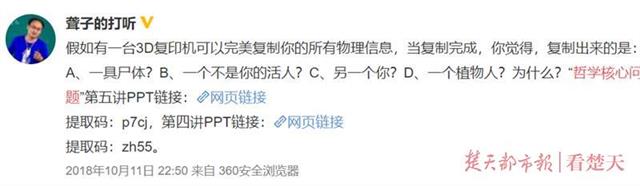 这道题的出题人,是武大哲学院教授、博导苏德超。前段时间,这道题在微博上之火了,还有人把它搬到“知乎”上提问,引来超过24万人次浏览,不少人提交了脑洞大开的“答卷”。每学期,苏德超都会布置意想不到的期末考题,往往都能火一阵子。但他说,自己不想当网红老师,安安静静当个学生们欢迎的“校红”挺好。