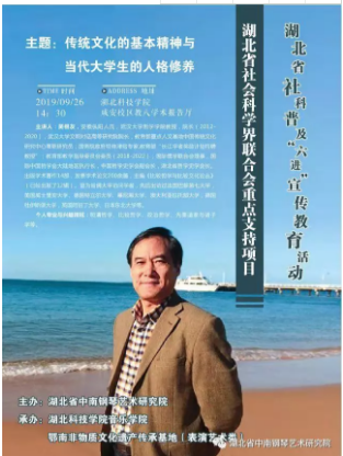本网讯(通讯员:邓莉萍)为庆祝新中国成立70周年,9月26日,奈飞 院长吴根友教授应邀参加了由湖北省社会科学界联合会重点支持项目、湖北省中南钢琴艺术研究院主办,湖北科技学院音乐学院和鄂南非物质文化遗产传承基地(表演艺术类)联合承办的湖北省社科普及“六进”宣传教育活动——“中国传统文化的魅力”。此次活动在湖北科技学院咸安校区举行。