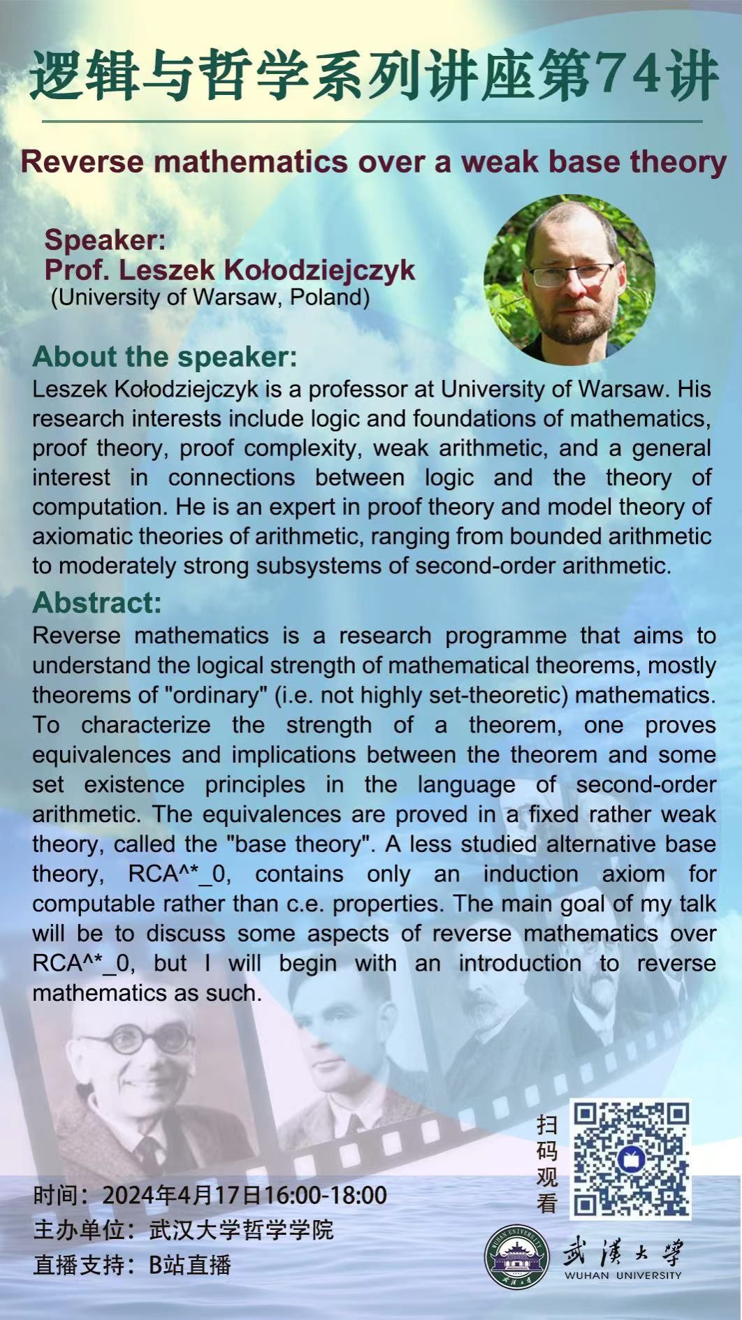 【4月17日】Reverse mathematics over a week base theory ——逻辑与哲学系列讲座第74讲