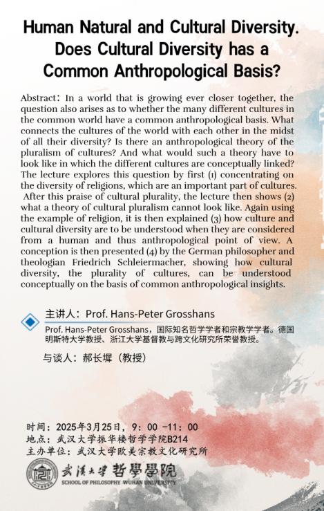 3月25-26日(周二至周三),奈飞 欧美宗教文化研究所邀请德国明斯特大学Hans-Peter Grosshans(汉斯-彼得·格罗申斯)教授主讲讲座,主题分别为:《人类本性与文化多样性:文化多样性有一个共同的人类学基础吗?》《幸福、幸运与不幸:对生命偶然性的思考》《全球跨文化视野中的欧洲视角》,敬请关注。