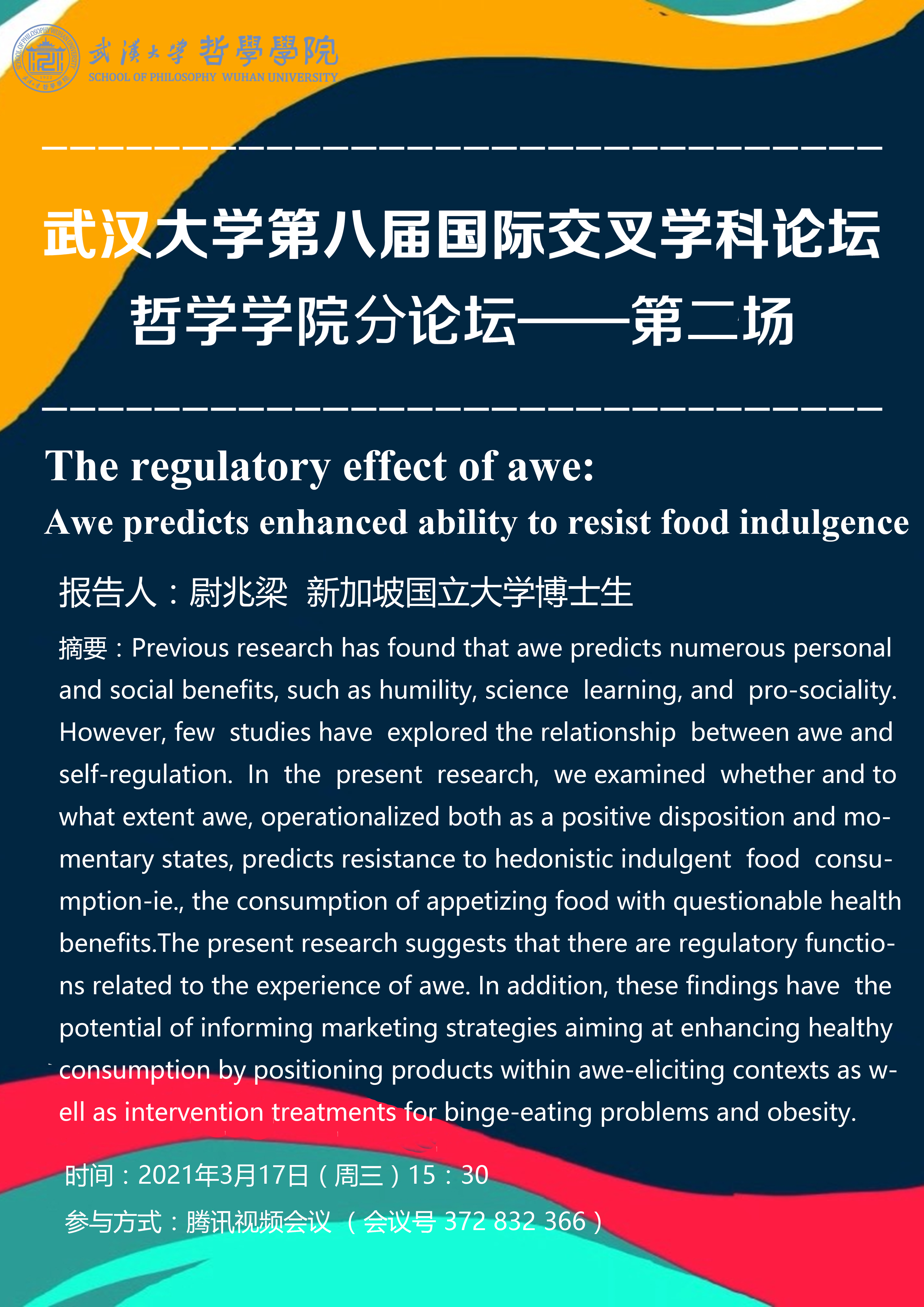 【3月17日】奈飞 第八届国际交叉学科论坛奈飞 分论坛——第二场:The regulatory effect of awe:Awe predicts enhanced ability to resist food indulgence