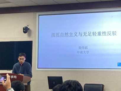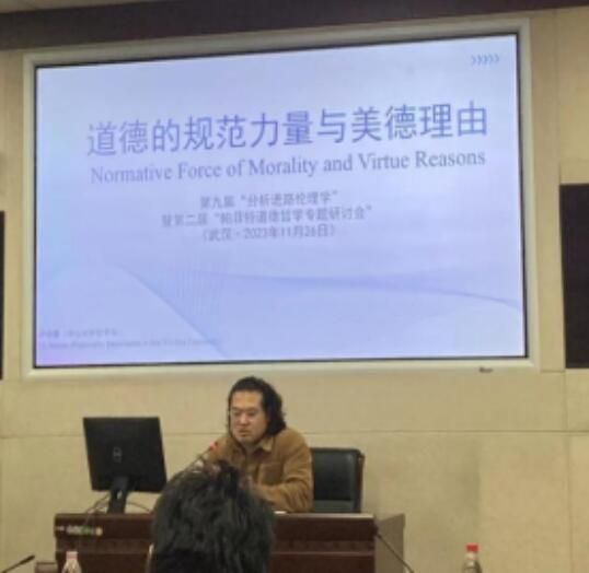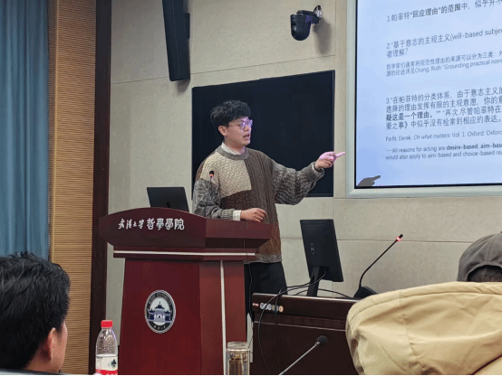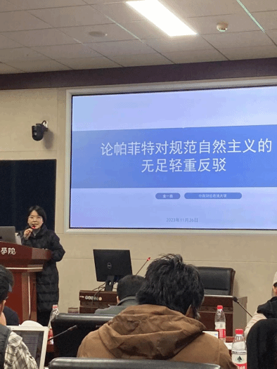 第三场报告人是中南财经政法大学金一鑫老师,报告的主题是《论帕菲特对规范自然主义的无足轻重反驳》。金一鑫老师首先对无足轻重反驳的背景做了陈述,然后介绍了柔性自然主义和刚性自然主义对无足轻重反驳的回应。金一鑫老师指出,无足轻重论证是基于规范属性与自然属性的差异,而自然主义者则是基于二者的联结,试图说明自然主义的规范性主张是实质性的。并且,自然主义者诉诸道德实践中规范性真理是不容易获取的,从而说明规范性主张并不是无足轻重的。此外,帕菲特指出,他的非自然主义观点与自然主义者的立场并不冲突。文章指出,即使自然主义者能够接受这一点,他们与帕菲特的观点分歧仍然是深刻的。