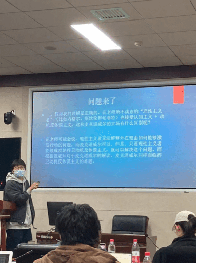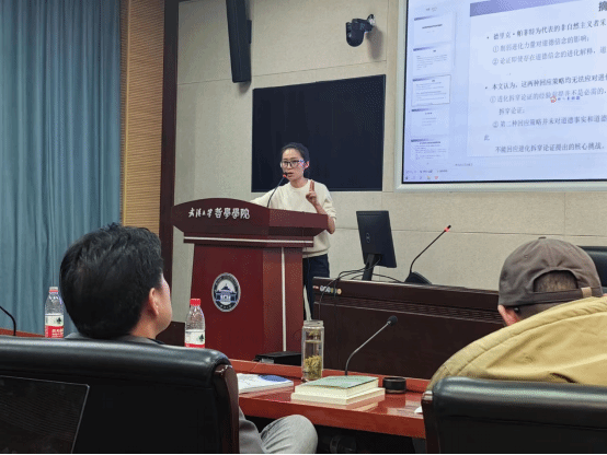 第二场报告人西南大学杜慧同学,报告主题是《论帕菲特对进化拆穿论证的回应》。杜慧同学分析了以帕菲特为代表的非自然主义道德实在论对进化拆穿的回应,主要有两种:一是削弱进化力量对道德信念的影响,二是论证即使存在道德信念的进化解释,道德事实依然解释道德信念。杜慧同学指出,这两种回应均无法应对进化拆穿论证的挑战,首先,进化拆穿论证的经验前提并不是必需的,反驳经验前提不足以回应进化拆穿论证;其次,第二种回应策略并未对道德事实和道德信念的关系提供合理解释,由此不能回应进化拆穿论证提出的核心挑战。