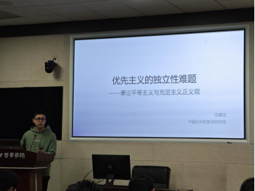 第一场的报告人是中国社科院哲学研究所范震亚老师,主题是《优先主义的独立性难题——兼论平等主义与充足主义正义观》。范震亚老师借助Feinberg的比较性正义(人际比较)与非比较性正义(自我比较)这一对概念区分来考察优先主义与平等主义、充足主义之间的实质性差异,并指出优先主义会因为对“处境较差者”的界定不清楚而在归类上会遇到困难,其中:关系优先主义与平等主义之间不一定存在差异,即使存在,也是非实质性差异;门槛优先主义与充足主义之间不存在实质性差异;绝对优先主义即便与平等主义、充足主义之间存在实质性差异,它也因缺少道德根据而无法被算作一种分配正义理论。