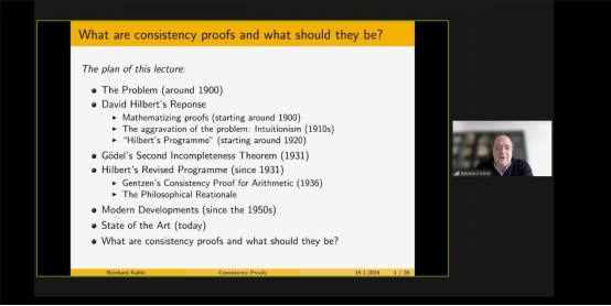 Kahle教授从历史的角度回顾了一百多年来一致性证明的起源和发展。他详细介绍了各个时代的逻辑学家从数学、哲学的角度提出的方法和新的挑战,并强调了一致性证明对数理逻辑的贡献和其哲学意义。