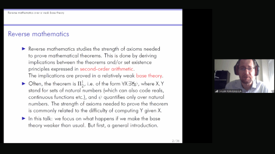 在第一部分中,Kołodziejczyk教授首先介绍了反推数学的研究目标——澄清证明某个数学定理所需要的公理强度,而这一目标具体通过考察二阶算术的子系统上数学定理和集合存在原则的逻辑蕴涵关系而实现。通常被考察的定理为∀X∃Yψ的形式,证明此类定理的公理强度通常与给定自然数集X计算Y的复杂性有关。