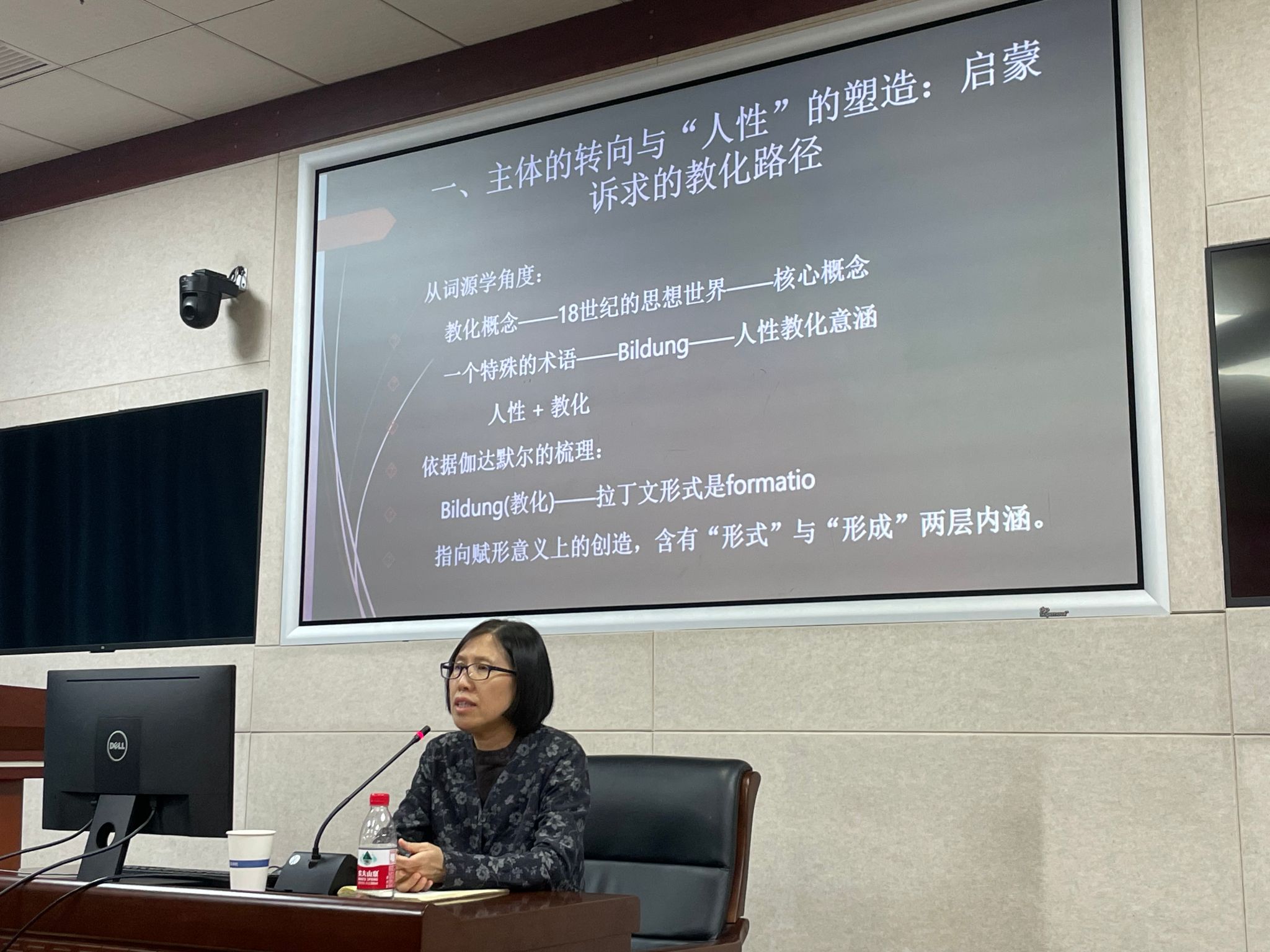 讲座第一部分,卢老师以词源学为线索梳理了“教化”的观念史,并揭示了“教化”概念与启蒙的内在关联。德语的“Bildung(教化)”概念起源于拉丁语的“formatio”,兼具“形式”与“形成”两方面的内涵。其“形式”内涵可以追溯到古罗马的“人文(humanitas)”概念——区别于以知识和技能的获得为核心的古希腊“教育(Paideia)”概念,“人文”概念指向的是人性本身的理想和自由状态;“教化”的“形成”内涵则透露出其明确的近代思想底色——作为一个过程性概念,“教化”不仅仅注目于作为理想的“形式”,更承诺了作为这一过程的基本前提的“人的现实存在”。然而仅仅“形成”内涵还不足以使得“教化”成为一个近代性概念,这一概念还必须被置于近代思想的主体转向中来理解。这一转向意味着:首先,教化的对象不是作为文化的被动载体的“人”,而是作为人自身的能力的“人性”;其次,呈现普遍性的理性和呈现现实性的感性都是人性的组成部分。正是在人性的层面上,从主体角度提升人性的“教化”与从理想层面审视人性的“启蒙”产生了内在关联——从启蒙角度看,人性的教化同时意味着与普遍性存在的关联,教化的过程同时是向着普遍性的推进。