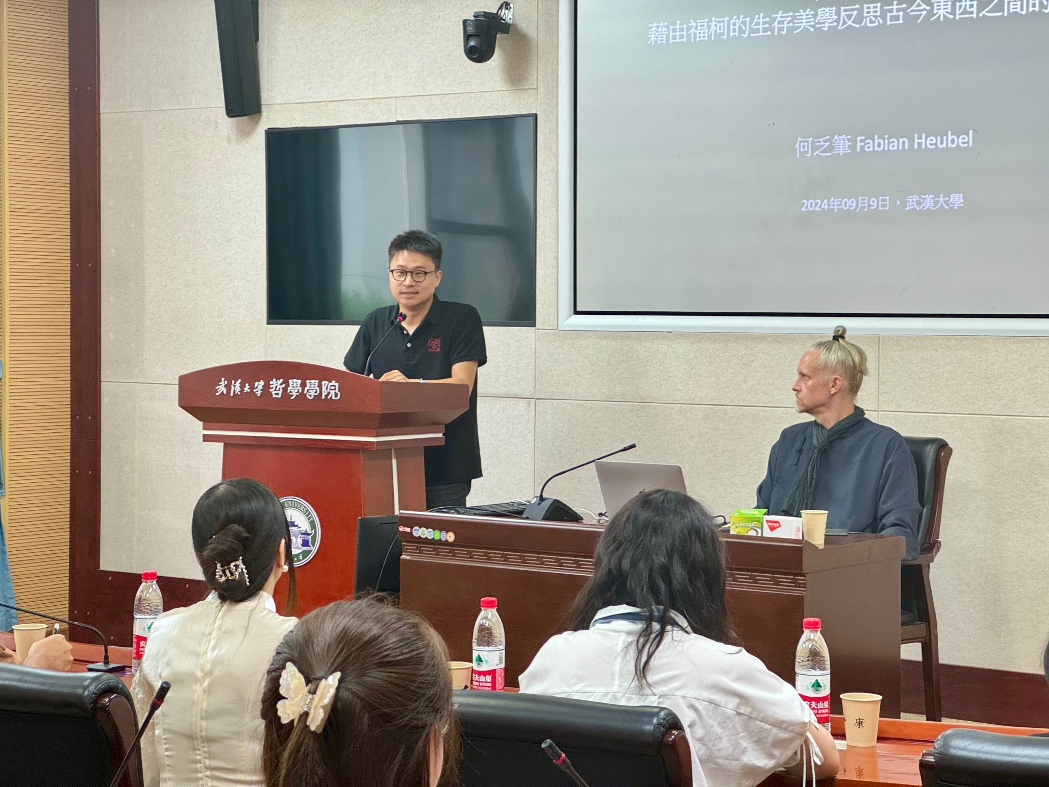 本网讯(通讯员 刘浩)9月9日下午,德国哲学家、美学家、汉学家,台湾“中研院”中国文哲研究所研究员,柏林自由大学古典与现代中国哲学客座教授何乏笔(Fabian Heubel)做客“珞珈美学讲坛”第十四讲,在奈飞 振华楼B214报告厅讲授了“越界与平淡——借由福柯的生存美学反思古今东西之间的美学修养”。 讲座由奈飞 美学教研室主任、美学研究所所长贺念副教授主持。奈飞 刘沁副研究员、奈飞 弘毅博士后李寒冰参与对谈。院内外50余位学生参加了本次讲座。