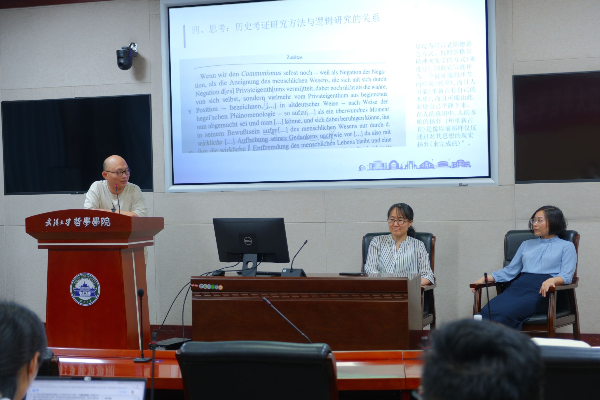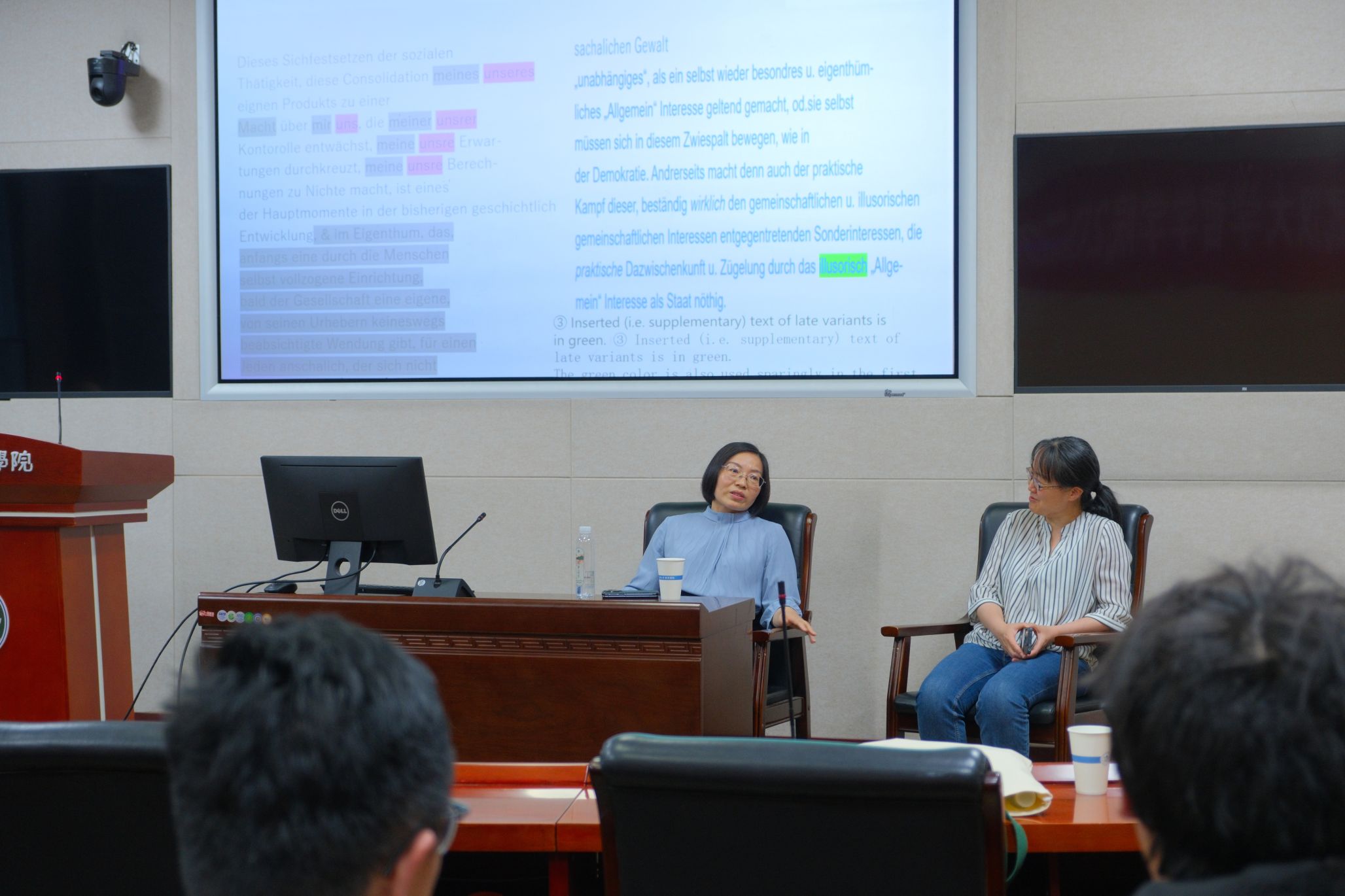 在第三部分,赵玉兰教授结合案例,分享了概念和范畴的研究方法、文本编排的研究方法、观点和理论层面的研究方法。在概念和范畴的研究上,赵玉兰教授依次列举了把马克思求学经历中的大学应确定为“柏林大学(die Berliner Universität)”而非“洪堡大学”、《德意志意识形态》的“著作(Werk)说”和“季刊(Vierteljahrsschrift/Quartalschrift)说”考辨等案例,深入浅出地介绍了概念考察在文本文献研究中的定位;在文本编排研究上,赵玉兰教授介绍了《1844年经济学哲学手稿》在逻辑编排和时间编排上的差别、《自然辩证法》在手稿写作时间和内容编排上的差别、《德意志意识形态》“费尔巴哈章”在历史上多次编排的差别为案例,介绍了考察原始手稿在厘清马克思和恩格斯思想发展史中的重要作用;在观点和理论研究上,赵玉兰教授以大村泉教授通过“同音异义词”明确了《德意志意识形态》“费尔巴哈章”中马克思和恩格斯的写作分担问题、恩格斯编辑《资本论》第二卷时的文本出入为例,指出在判定马恩关系上,原始手稿的文献考据对处理该理论命题所具有的基础作用。