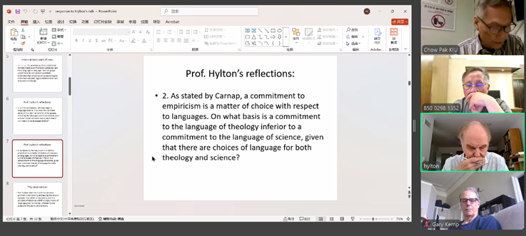 随后的提问环节,格拉斯哥大学加里×坎普教授提问:蒯因的立场是否比卡尔纳普更能有效地批评“坏科学”(如神学理论)?卡尔纳普的宽容原则似乎使他无法从外部批评一个内部自洽的神学语言框架,而蒯因似乎可以。