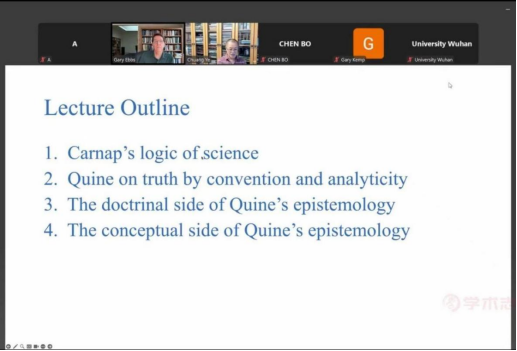 加里·埃布斯教授的讲演包含四部分内容:卡尔纳普的科学逻辑;蒯因论约定真理和分析性;蒯因认识论的“学说方面”;蒯因认识论的“概念方面”。