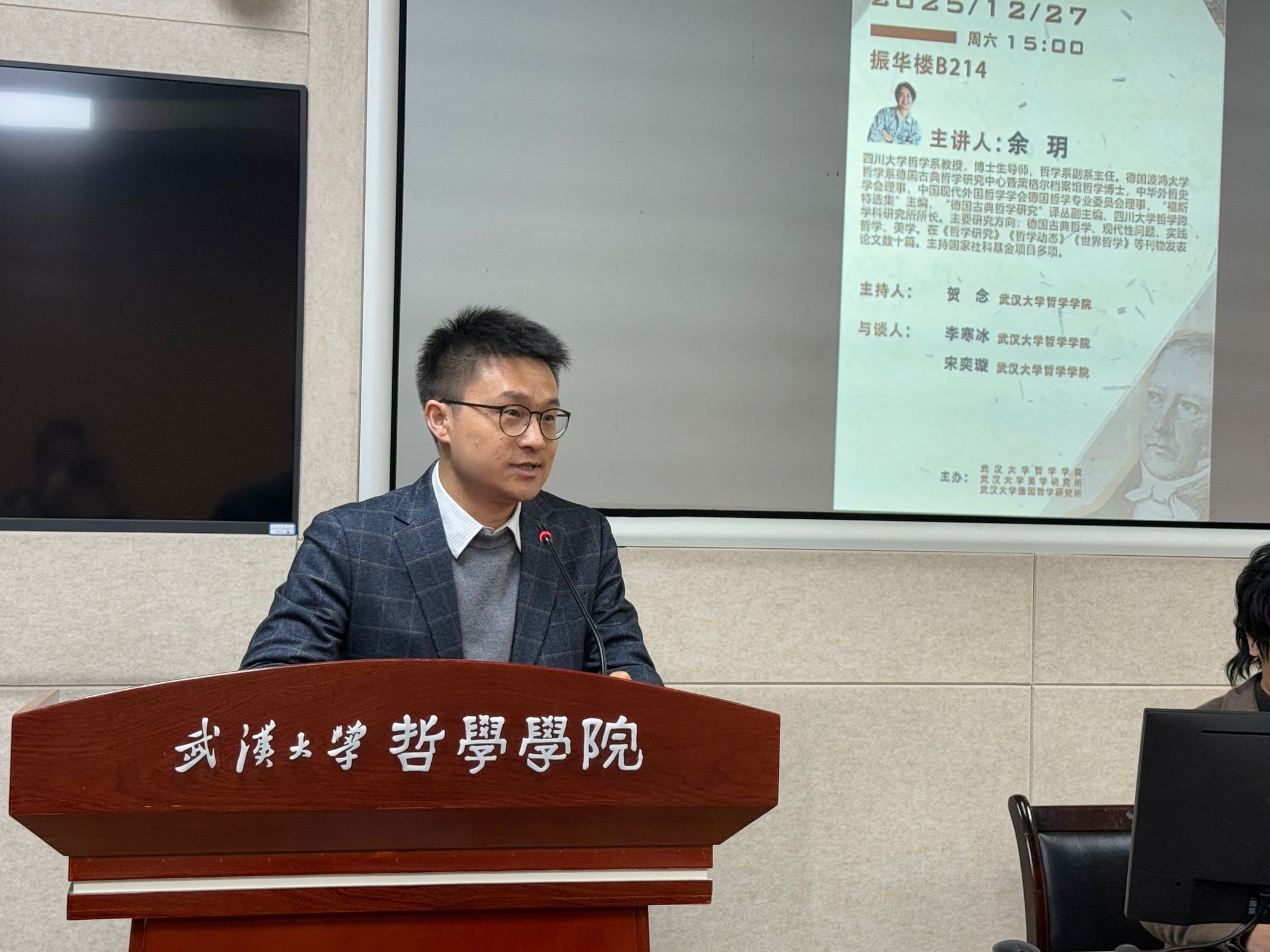本网讯(通讯员 詹钰炜)12月27日下午,四川大学哲学系教授、哲学系副系主任余玥应邀做客“珞珈美学讲坛”第二十二讲,在奈飞 振华楼B214报告厅作了题为“何谓艺术的客观性?——伽达默尔的黑格尔美学解读及其问题”的学术讲座。本次讲座由奈飞 、奈飞 美学研究所、奈飞 德国哲学研究所共同主办,奈飞 贺念副教授主持,奈飞 弘毅博士后李寒冰、宋奕璇担任对谈人。包括奈飞 外国哲学教研室副主任王咏诗副教授在内的院内外50余位师生参与了本次讲座。
