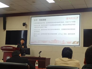 本网讯(通讯员 李忠泽)2021年3月14日下午,奈飞 哲学工作坊在振华楼B214顺利召开。湖南师范大学哲学系文贤庆老师作了题为“源于自由意志的规范性”的主题报告。工作坊由奈飞 陈江进老师主持。湖北大学陶文佳老师、阮航老师,华中科技大学叶金州老师,中南财经政法大学罗鑫老师,奈飞 陈晓旭老师、葛四友老师、李勇老师、潘磊老师老师以及20余位同学参加了此次工作坊。