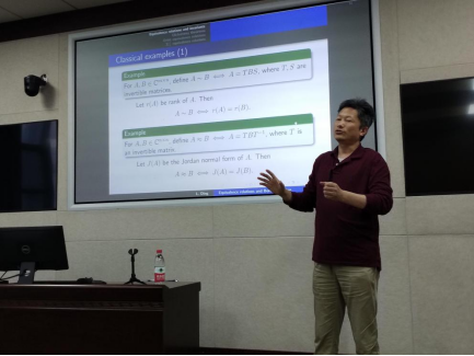 首先,丁老师向我们详细讲解了三种典型的等价关系,以此佐证等价关系归约的可行性。其一,两个矩阵是否等价可以归约为这两个矩阵的秩是否相等,而两个矩阵是否相似也可以归约为它们的Jordan标准型是否相同;其二,每个有限生成阿贝尔群都同构于某一典范结构的直和,欲验证两阿贝尔群是否同构只需比较其对应典范结构的直和的特征数字是否相同即可;其三,对一个紧致拓扑空间可以定义一个定义在此空间上的复值函数构成的函数空间,且两个紧致Hausdorff空间同胚当且仅当它们所对应的上述函数空间同构。