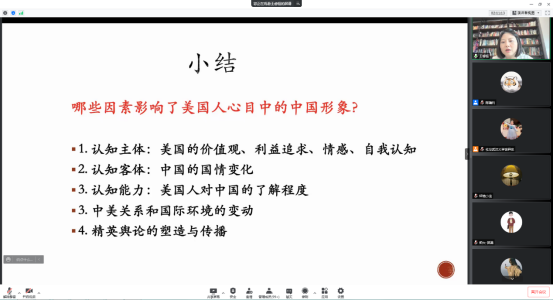 王睿恒教授总结了对美国人心目中“中国形象”构成影响的因素,包括认知主体、认知客体、认知能力、中美关系和国际管径的变动、精英舆论的塑造和传播五个方面。