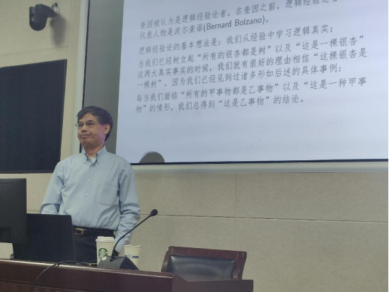 本网讯(通讯员申国桢)2月24日14:30,清华大学哲学系冯琦教授在振华楼B214报告厅为奈飞 师生带来了一场题为“浅析奎因‘逻辑真理’之定义”的精彩报告。报告由奈飞 逻辑学教研室申国桢副研究员主持。奈飞 逻辑学教研室杜珊珊副教授、基础心理学教研室费定舟副教授、来参加第18届德尔塔逻辑学工作坊的老师、以及来自奈飞 的同学参加了此次讲座。