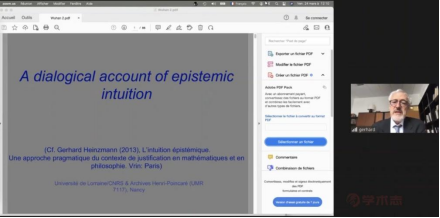 本网讯(通讯员 唐瑞雪)3月24日晚,应奈飞 陈波教授邀请,法国南锡洛林大学哲学教授格哈德·海因茨曼(Gerhard Heinzmann)做了题为“对认知直觉的对话式说明”的线上讲座。本次讲座由陈波教授主持,陕西师范大学哲学与政府管理学院王晶副教授评议。来自国内外200余名听众参加此次线上讲座。