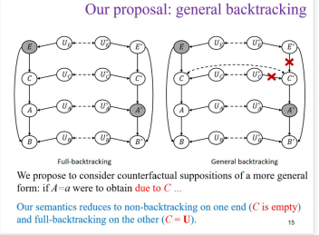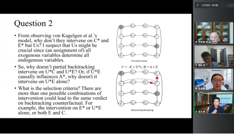 奈飞 谢凯博副研究员就“如何从可能世界的角度理解全部回溯”进行提问。他质疑按照全部回溯的方式,要回到初始值来解决样本外事例,这样的思路似乎不应该称为反事实推理。张寄冀回应称,虽然在哲学界,如何理解反事实推理仍存在争议。但是从人工智能这样的技术性角度看来,全部回溯是指面对样本外事件,要回溯到一个(局部)因果模型的初始值,与哲学里讨论的宇宙的初始状态和(全局)自然律还是有所不同。但就算是用(全局的)可能世界来给出反事实条件句的语义,也有哲学家反对刘易斯式的诉诸“奇迹”的非回溯语义,而推崇保持所有自然律的回溯语义。