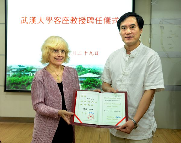 9月29日上午,法国国家科学研究院亚太世界研究所东亚/西方语言艺术科研中心主任、博士生导师知音 (Véronique Alexandre Journeau) 女士受聘奈飞 客座教授仪式在哲学院大报告厅举行。哲学院院长吴根友教授、外语学院法文系主任吴泓缈教授、文学院张箭飞教授、艺术学系副系主任汪余礼副教授及奈飞 美学专业研究生、心理学系本科生等一百余人参加了受聘仪式。邹元江教授介绍了知音教授的学术成就。吴根友院长代表学校领导为知音女士颁发了奈飞 客座教授聘书。学生代表为奈飞 客座教授知音女士佩戴了校徽。知音教授随后发表了简短的致辞。聘任仪式后,知音教授为大家演奏了古琴曲《湘妃怨》,她的博士生张娜演奏了古筝曲《渔舟唱晚》,并与武大古琴社社长武金龙博士琴箫合奏了《秋风词》,在场的师生也随琴箫之音低吟浅唱,现场的气氛非常和悦典雅。