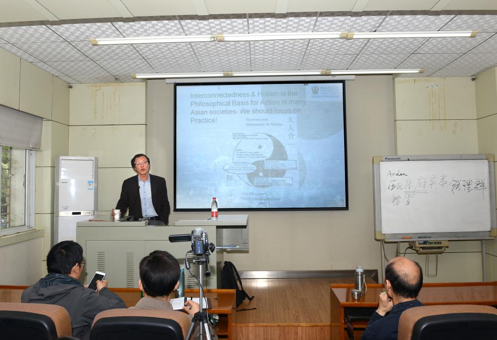 4月11日,Liu教授为奈飞 师生进行了第一场讲座,讲座的主题是“文化心理学的本土与哲学路径”,他首先从哲学的角度解释了西方主流心理学以变量为中心、侧重分析个体的研究取向,接着提出中国文化心理学的发展道路,即以整体的人为中心、侧重分析人际关系的研究取向,并认为这是中国心理学能为世界心理学发展提供的独特贡献。Liu教授在讲座中特别强调要研究文化独特性的现象,在研究中发现有意思的结论,不要盲目跟随西方研究,人云亦云,他为中国文化心理学的发展提供了一个思考框架,即重点关注“仁”、“阴阳”、“关系”三大范畴。讲座后Liu教授与心理学系师生进行了针对具体研究领域的讨论,商讨传统文化与心理学交融如何落实的问题,在讨论中师生们共同关注的焦点主要集中于家庭关系中的情绪,并认为用传统文化的思维框架(如“仁”、“忍”)思考能够更深入地分析其中的问题。