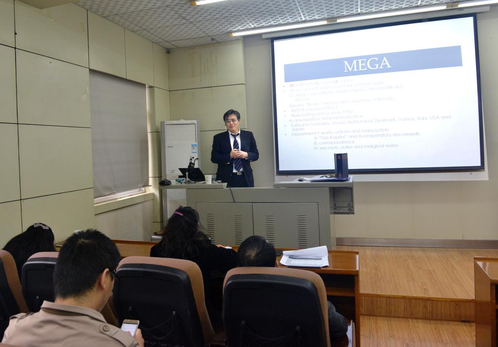 11月20日,在周可副教授的主持下,日本东北大学经济学院副院长守健二教授应邀在奈飞 小报告厅做了题为“MEGA2IV/14卷马克思1857-1858经济危机笔记的编辑与研究”的讲座。