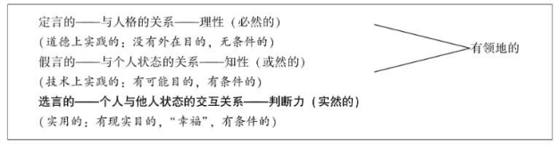 康德将刻画意图(与目的相关)的三重区分——也就是命令式的三分与模态范畴关联起来:或然的、实然的和必然的。这个区分关涉的是命令式的方式,“技术的-实用的-道德的”则对应地标明了它们的领域:技巧(Geschicklichkeit)、明智(Klugheit)和道德(Sittlichkeit)。