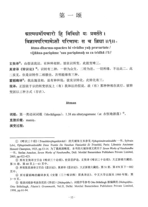 《唯识三十颂》是大乘唯识宗创始人世亲的晚年重要著作,不仅篇幅极短,许多不为外人所知的哲学思想也被加密到梵语词汇的词根、词缀中。梵语语法集大成者波你尼创立的梵语文法学派被誉为“印度核心文化的核心”,具有最权威的文献诠释权。