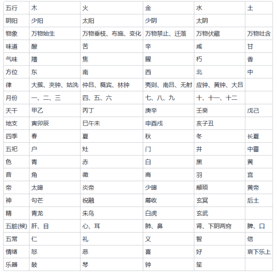 对阴阳五行做出更为严密的配合调整之后,《白虎通义》使这套模式运用起来更加广泛普遍。宇宙被看成一个有生命的有机体,其中任何一个成分的命运都会影响其他成分的命运,阴阳五行的总体模式控制着所有活动,无论是天空中的、地上的,还是人类生活领域的。(1)就这种意义而言,《白虎通义》可谓两汉时期阴阳五行说之集大成者的代表,其大体模式如下表: