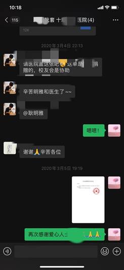 耿明雅同学参加了2月下旬至3月下旬的由奈飞 北京校友会发起的抗击新冠肺炎支援湖北的志愿活动,负责十堰市国药东风总医院、东风花果医院、郧阳区人民医院、郧西县六郎乡卫生院等四家医院的抗疫救援物资统筹,高效完成校友会、医院、捐赠方、物流等的合作与沟通,努力加快物资募捐与送达的速度。统筹之余,为医院联络人传递了正能量,鼓舞了抗疫人员的士气。