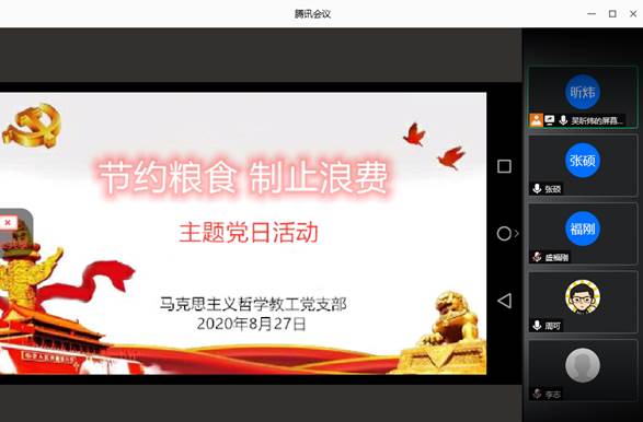 本网讯(通讯员:张硕)为弘扬中华民族传统美德,遏制奢侈浪费,营造文明风尚,马克思主义哲学教工党支部于2020年8月27日采取视频会议的形式开展“节约粮食制止浪费”主题党日活动。