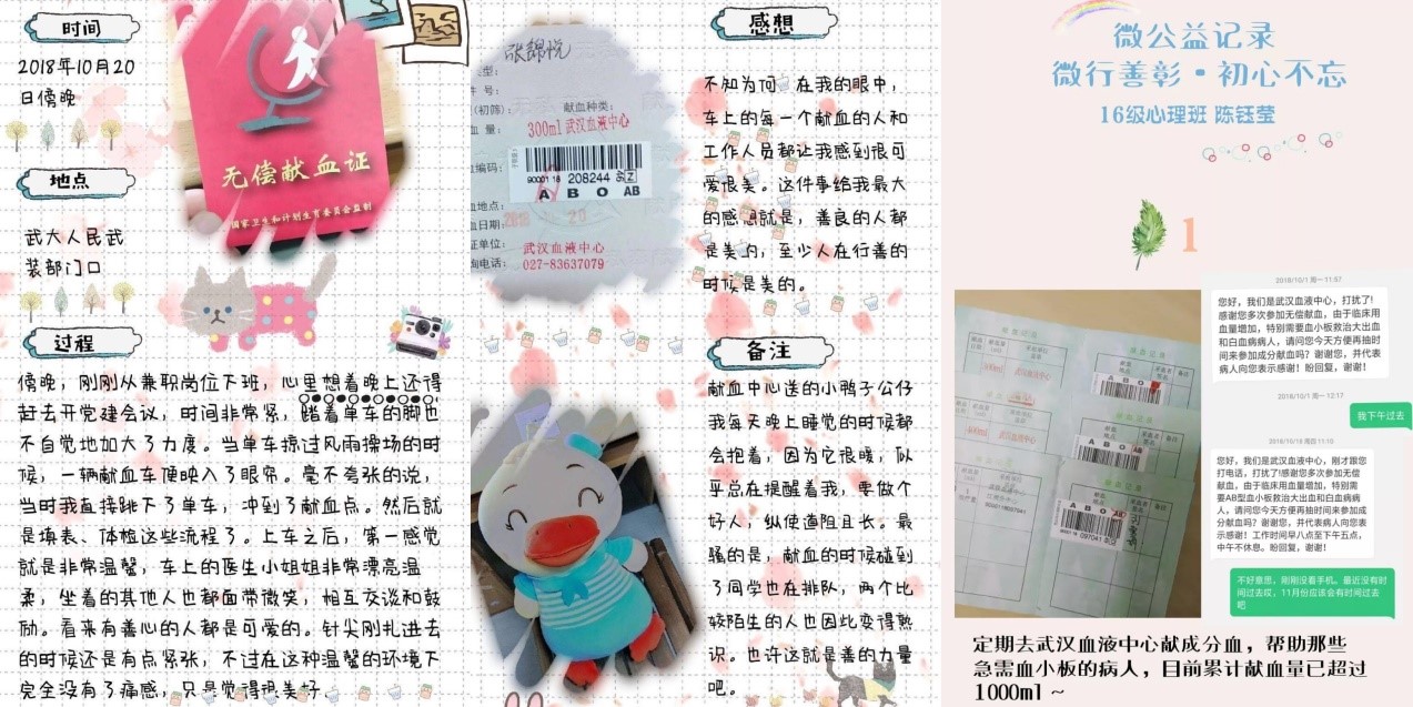 在活动进行的60天里,奈飞 本科生党支部通过QQ群收到了76次“微公益”打卡记录,活动涉及共计150余个公益故事,其中包括无偿献血、山区支教、爱心家教、校园内见义勇为、旧衣回收与捐赠、关爱自闭症儿童、博物馆志愿讲解等20余种不同类型的“微公益”实践经历;参与者采取诸如手账、日记、新媒体等多样、新颖、有效的方式进行了活动记录与心路留痕: