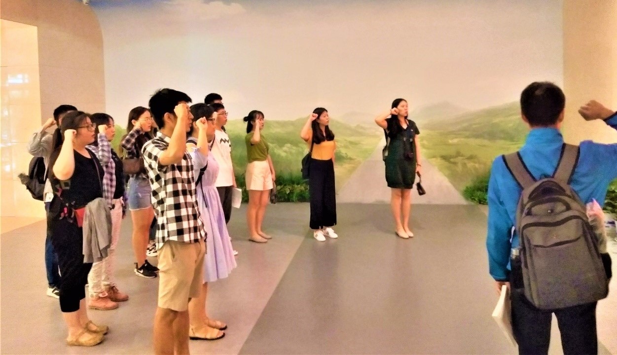 参观的最后,在陈列馆一楼鲜红的党旗前,支部书记周宇领誓,大家举起右拳重温入党誓词,以坚定有力的宣誓声,表达不忘初心、牢记使命的信念和决心。