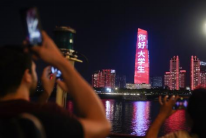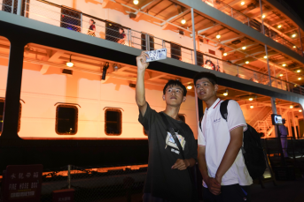走出充满故事的船舱,登上顶层甲板,历史的余韵仍未散去,璀璨灯光与粼粼波光却立刻吸引了大家的目光。两江四岸开学季主题灯光秀,向新生们发出了“莘莘学子 扬帆起航”“你好大学生”的热情问候。