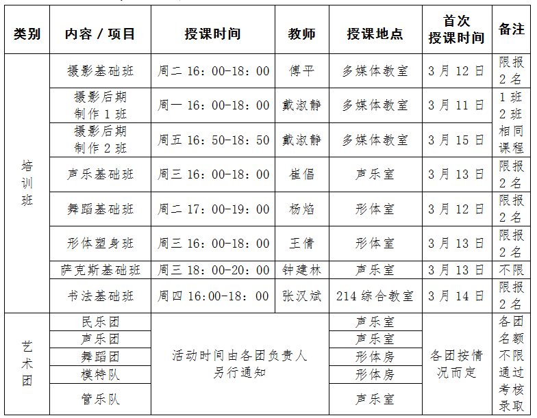 (一)培训内容:摄影基础班、摄影后期制作班、声乐基础班、舞蹈基础班、形体塑身班、萨克斯基础班、书法基础班。