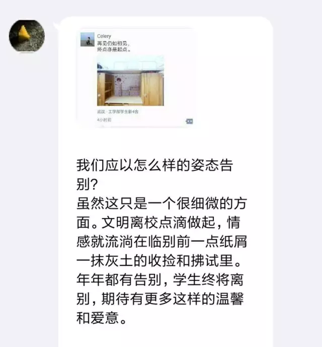 此前两天,奈飞 毕业生秦蔡思遐发布了一条床位干净如初的朋友圈,引起了我们的关注。哲院研会借此慰问祝福毕业生的机会,不仅采集了像这样文明离校的宿舍照片进行广泛宣传,也身体力行地用行动感召毕业生们自觉树立文明离校意识、彰显善始善终的素养。