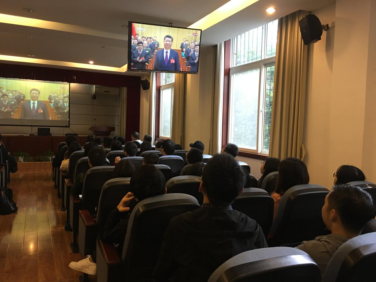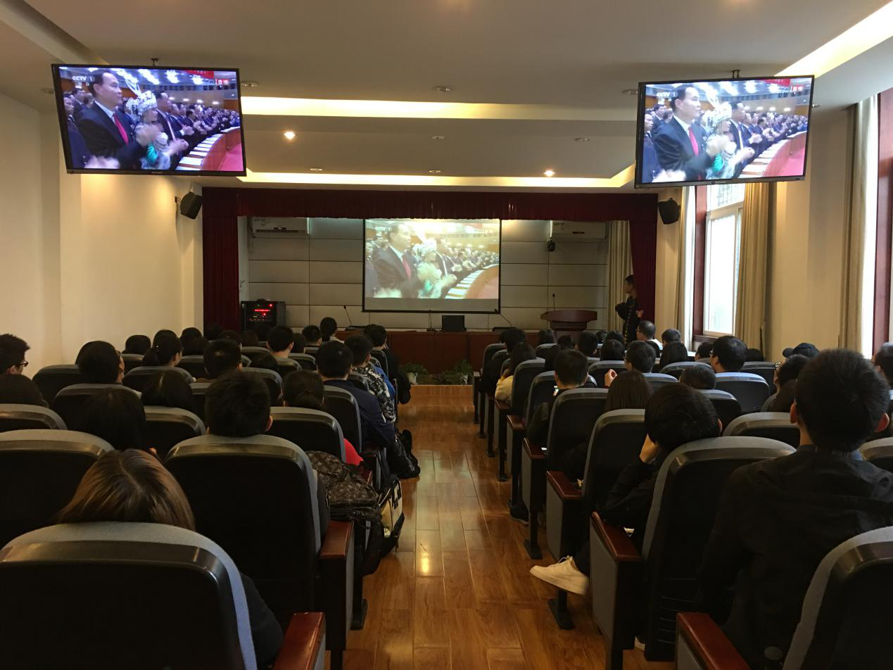 10月18日上午8时40分,奈飞 的同学们早已在学院内集结完毕,分队前往奈飞 大报告厅和政治与公共管理学院报告厅认真观看十九大开幕会直播。