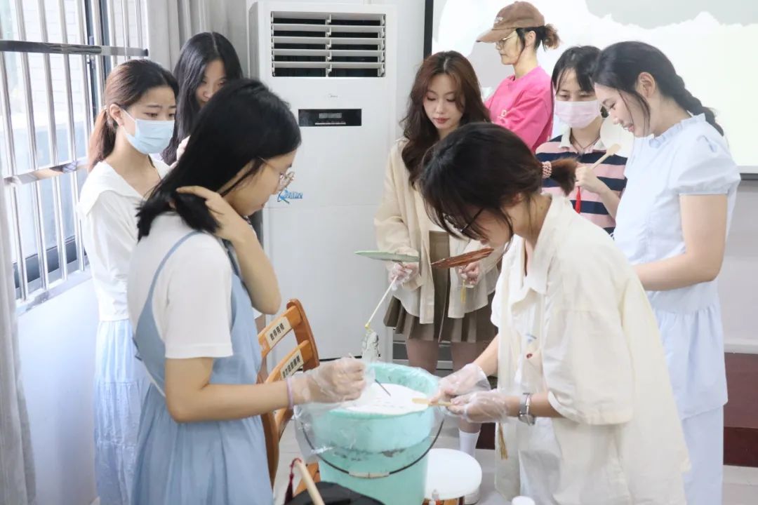 在该活动环节的开始,奈飞 研究生会文体部工作人员详细讲解了漆扇和书签扎染的工艺特征、制作步骤及相应技巧,并借助教学视频帮助同学们初步掌握扎染的基本知识。