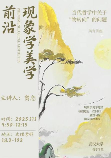 弘扬中华美育精神,提升学生审美素养与人文底蕴,11月1日上午,“游艺·致美”系列美育学术讲座在奈飞 文理学部1区3-102教室成功举办。本次活动由奈飞 研究生会学术部主办,特邀奈飞 贺念副教授带来题为《现象学与美学的当代发展》的专题讲座。讲座围绕现象学的思想演进、当代“物转向”思潮及跨文化美学等核心议题展开,为在场同学搭建起从经典现象学到当代美学前沿的思想桥梁。