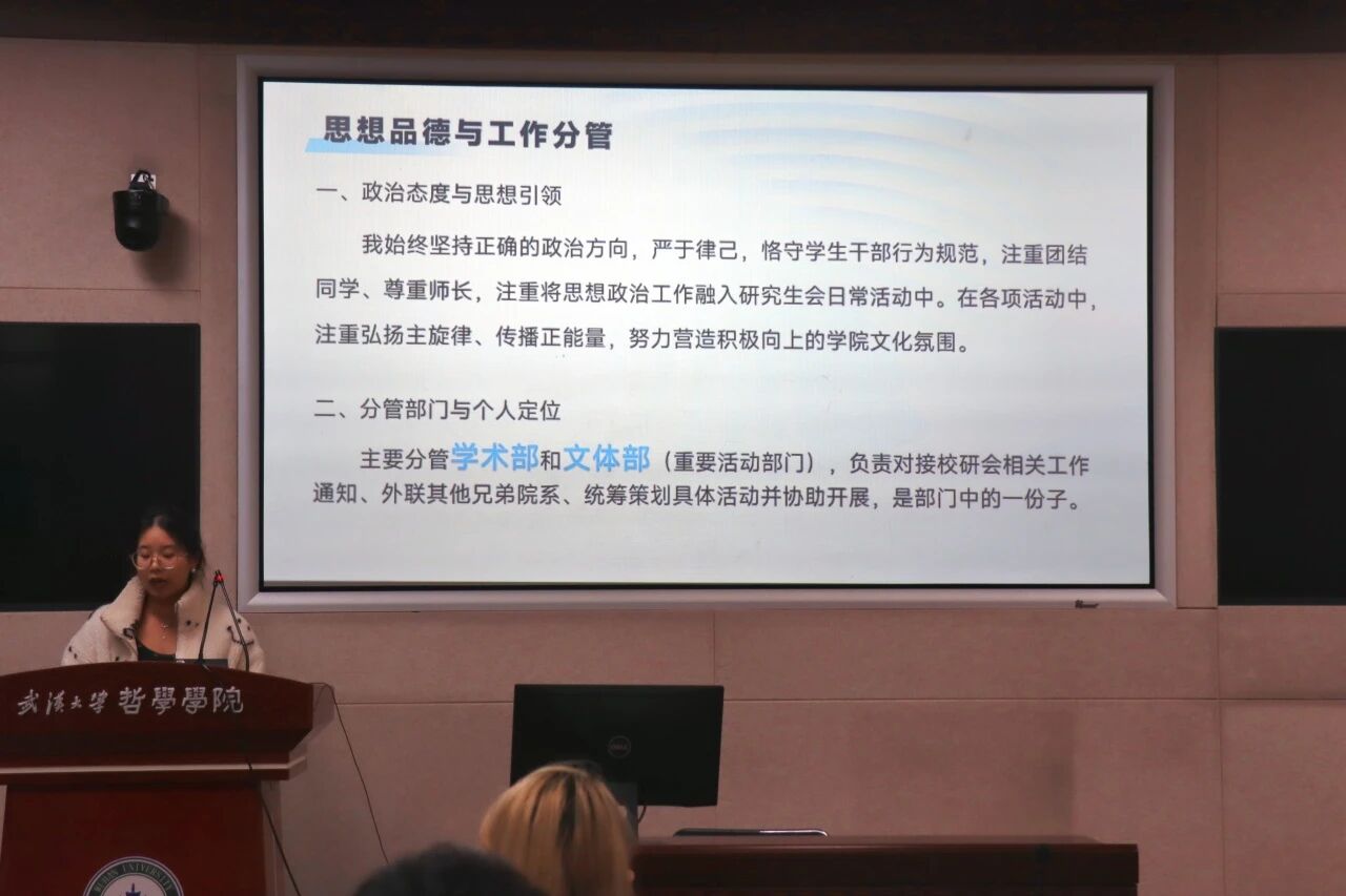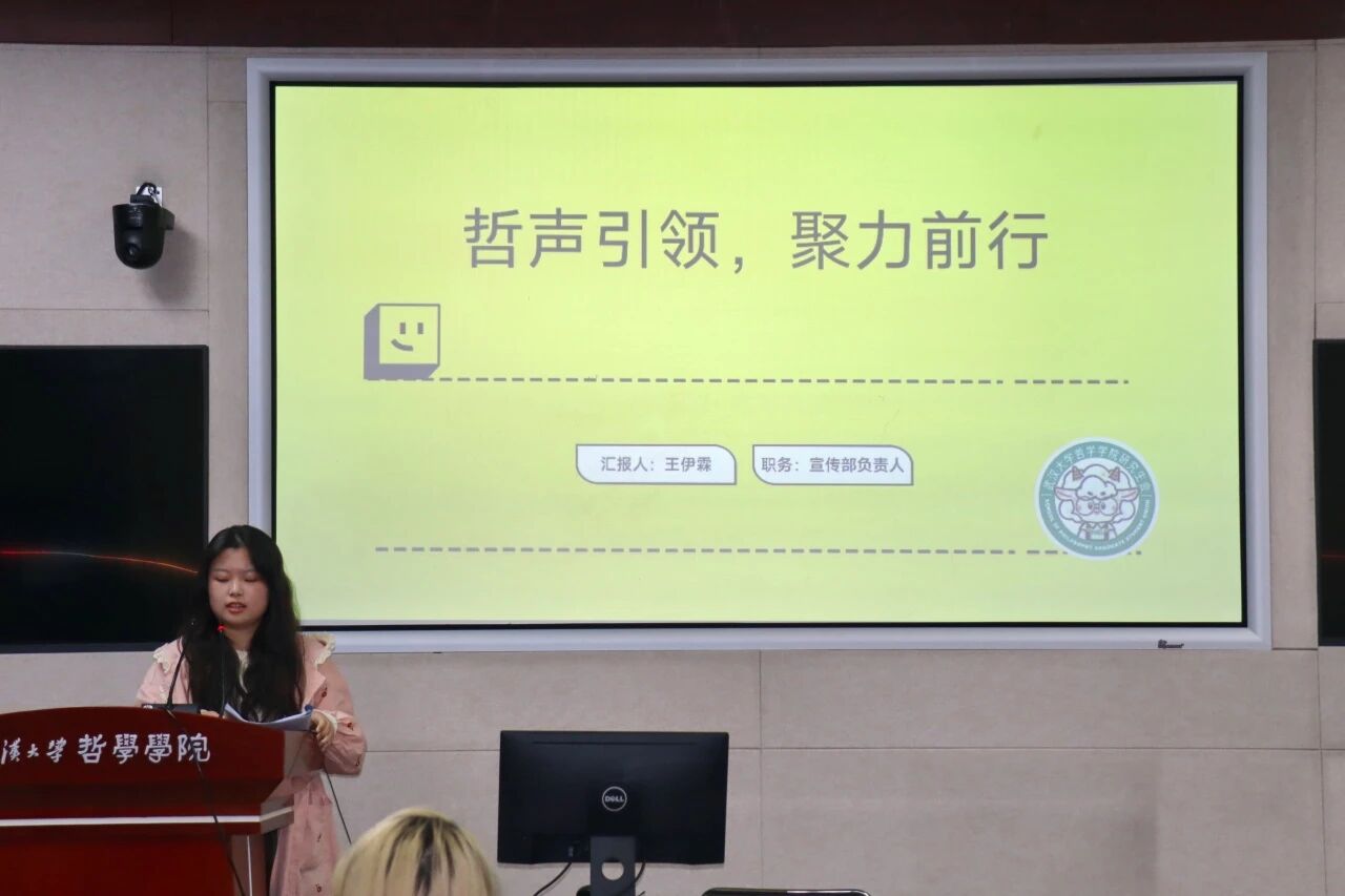 宣传部负责人王伊霖系统介绍了部门在公众号运营、栏目创新与专项宣传方面的工作。她指出,部门持续深耕“武大哲院研究生会”公众号平台建设,成功打造了“哲林新声”等一批具有影响力的品牌栏目,获得了师生的广泛关注与好评。面向未来,她表示宣传部将继续优化宣传流程,提升内容品质,创新呈现形式,以更专业的宣传矩阵全方位展现哲院学子蓬勃向上的精神风貌。