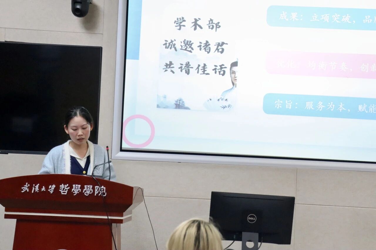 学术部负责人徐静汇报了部门在学术科技节项目申报与系列活动推进中取得的成果。上一学期学术部成功推动五个项目立项,其中“哲学+”跨学科系列已成功举办多期,有效促进了哲学与新闻、心理、艺术等领域的深度对话;“破茧立言·名师领航”论文工作坊也稳步推进。展望未来,她表示将着力优化活动安排、提升互动体验,并加强跨院系合作,持续拓展学术活动的广度与深度。