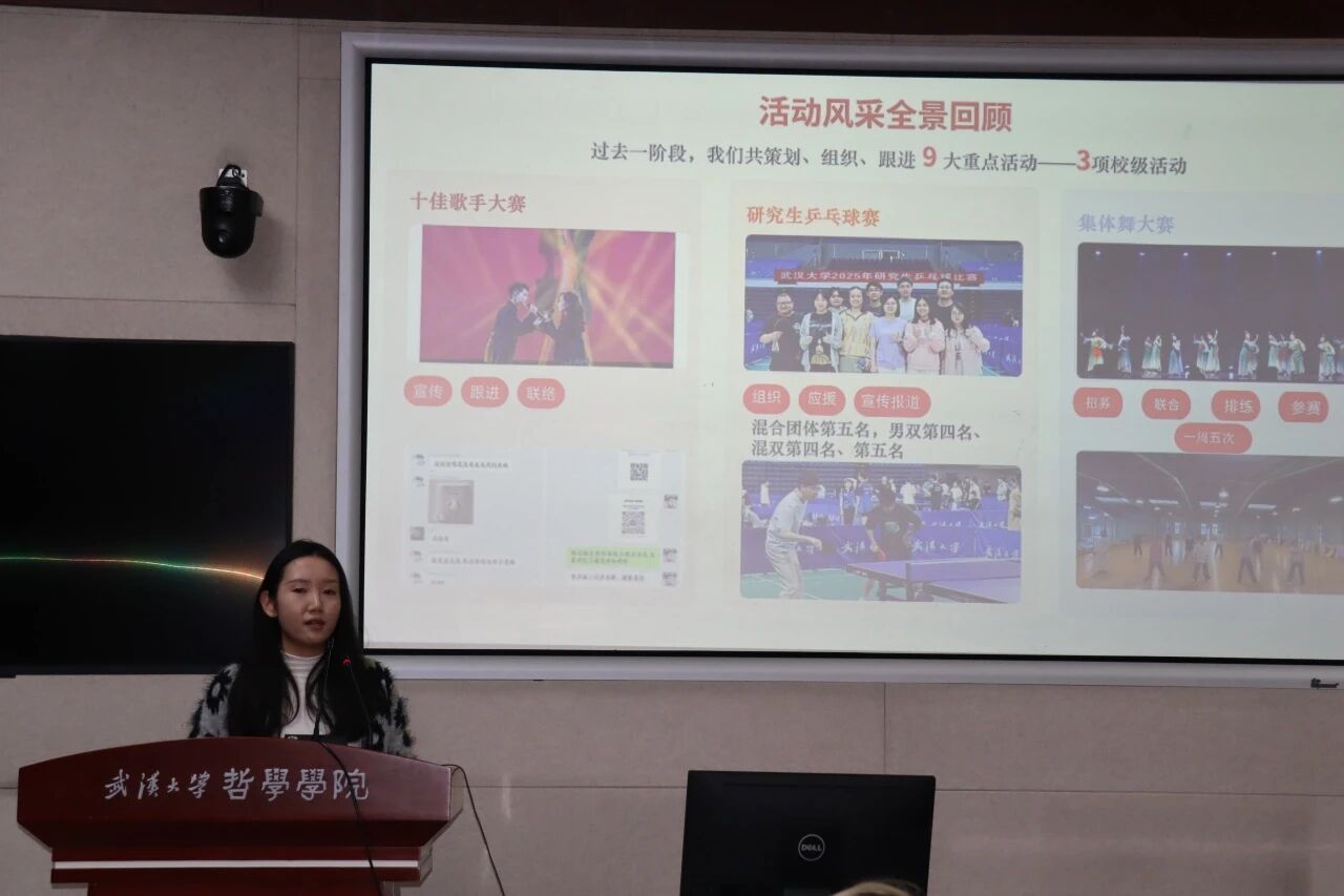 文体部负责人秦越系统回顾了本学期工作,部门在组织校级品牌赛事与创新院级活动方面取得显著成效,成功举办了研究生十佳歌手大赛、六院“草坪音乐节”、“振华杯”羽毛球赛等多项品牌活动。同时,她也指出在活动参与度、内部协作等方面仍有提升空间,未来将着力推动活动精准化、加强团队建设、深化跨院合作,持续提升文体活动的覆盖面与影响力。