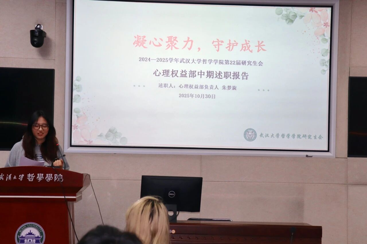 心理权益部负责人朱梦旋以“凝心聚力,守护成长”为主题,从心理健康服务、权益维护、志愿服务与跨部门协作四方面汇报工作。她强调,部门已成功举办系列心理健康节立项活动,并持续推进“哲研权益助手”平台运营,收集并反馈同学生活与学业提案10余条,积极参与张家湾社区志愿服务等活动。在总结工作成果的同时,她也指出了当前部门在权益服务渠道、活动覆盖面等方面还有提升空间,并提出了多项改进思路。