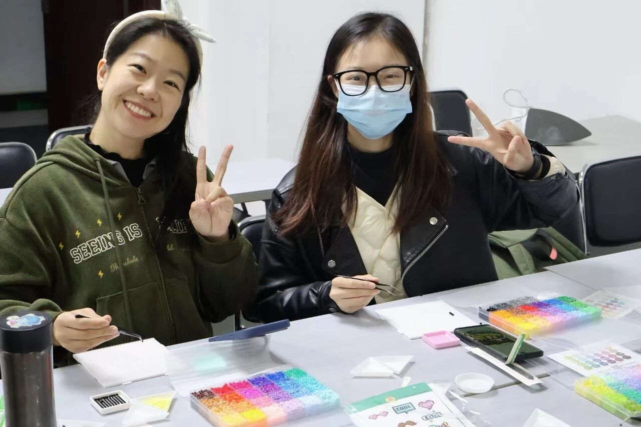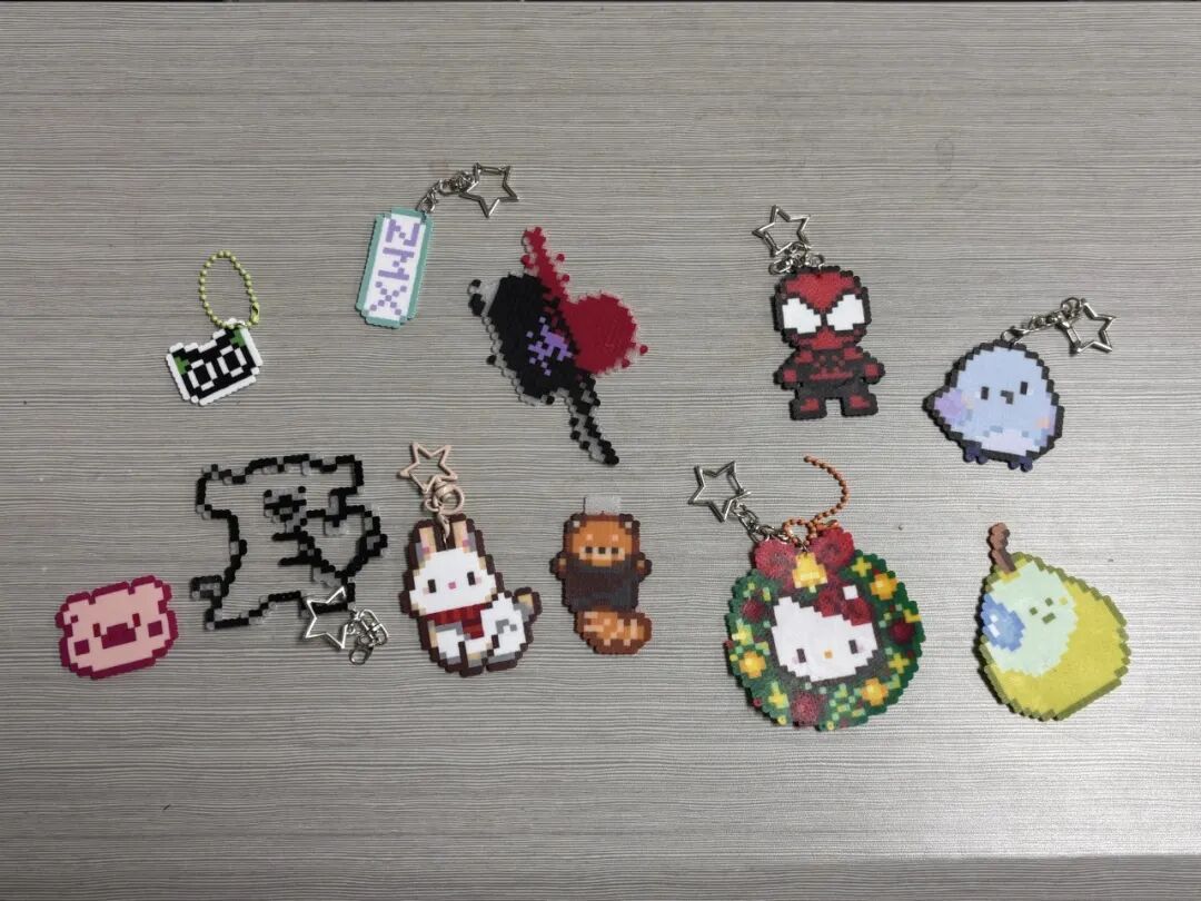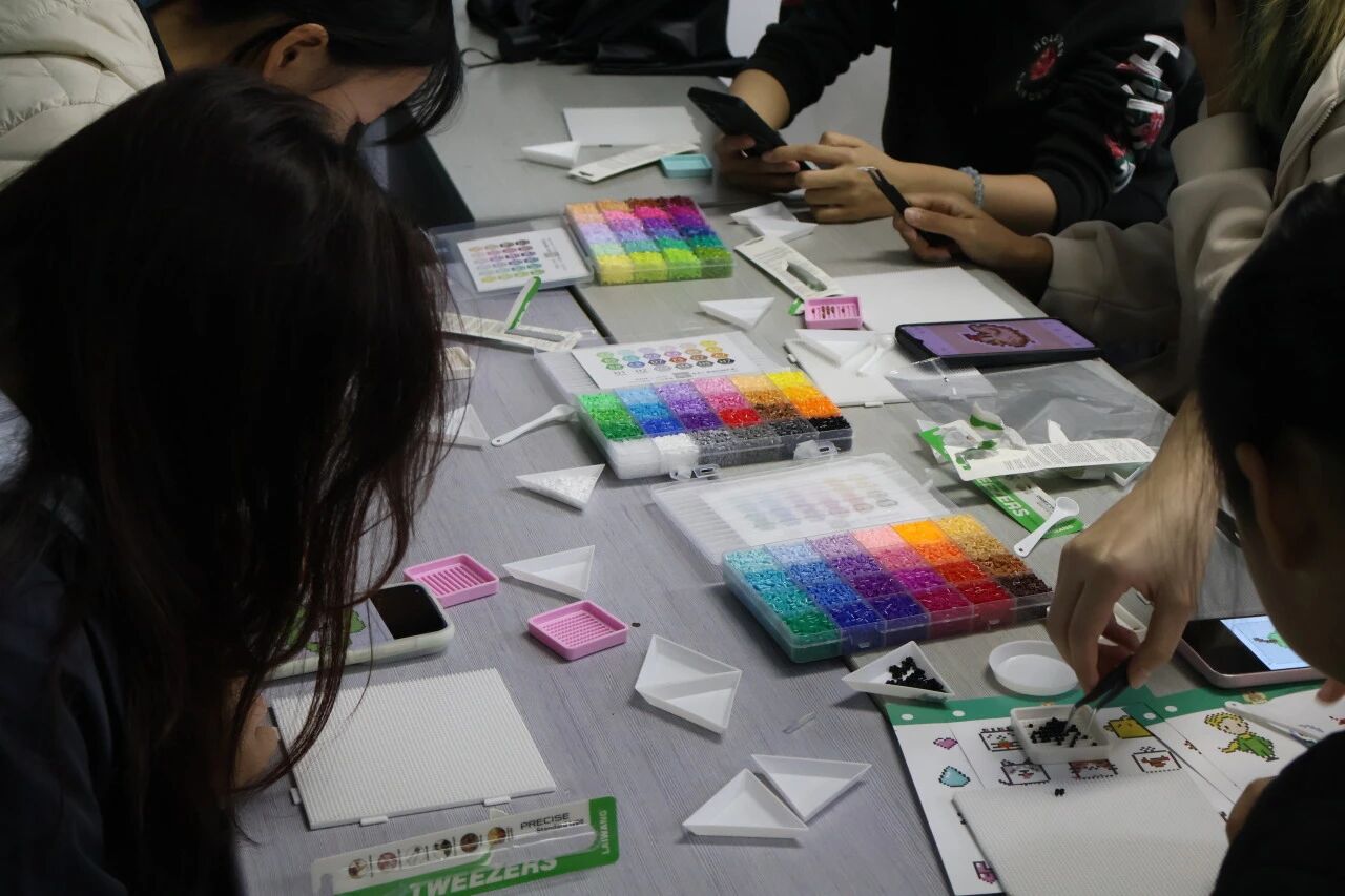 活动伊始,在主持人的讲解下,同学们熟悉了拼豆的制作过程,投入到轻松愉快的创作中。排球、乌萨奇、小王子、蜘蛛侠、凯蒂猫……一颗颗细小的拼豆在手中被拼接成各式图案,每个人都沉浸在专注与疗愈的氛围之中。手作的节奏让紧绷的心弦逐渐松弛,交流与笑声在小组之间流淌,温馨的氛围悄然蔓延。