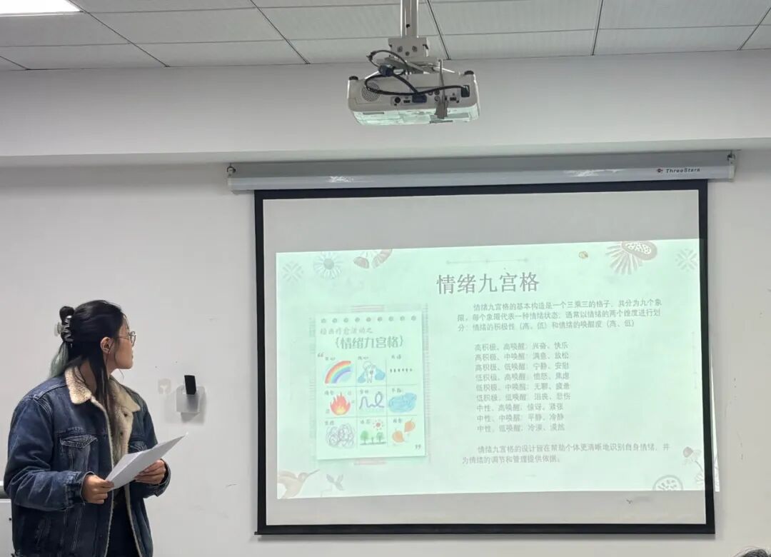 在第二环节“心理觉察课堂”中,主持人带领大家回顾近期生活,进行了一场从指尖到心间的自我探索。伴随舒缓的音乐,同学们绘制出属于自己的“情绪九宫格”,用文字与色彩记录下内心的多重情绪——开心、焦虑、期待、疲惫、成就感、失落……这些看似琐碎的情绪片段,拼合成了每个人真实的生活。主持人还带来了“情绪颗粒度”心理小课堂,让同学们学习如何识别与命名自己的情绪、在自我对话中温柔地关注与接纳自己。