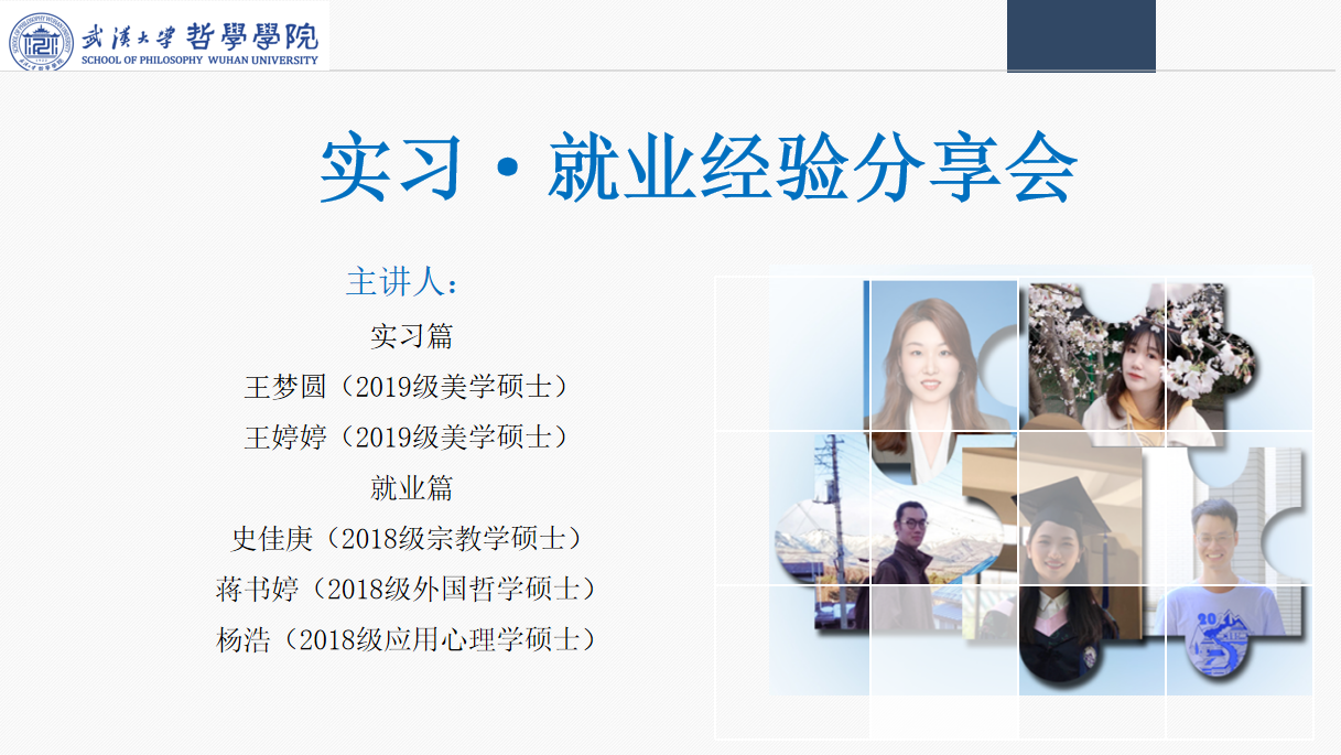 2021年6月17日下午15点,由奈飞 研究生会主办的“实习·就业经验分享会”在奈飞 B107顺利举行。本次经验分享会由2020级硕士研究生修风翊主持,内容分为实习和就业两个篇章,分别邀请到了2019级美学硕士研究生王梦圆以及王婷婷分享实习经验,2018级宗教学硕士研究生史佳庚、2018级外国哲学硕士研究生蒋书婷、2018级应用心理学硕士研究生杨浩分享就业经验。研究生兼职辅导员杜金玉出席了此次活动。