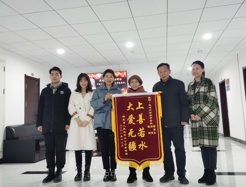 (通讯员:杜金玉)“感谢学院提供这么好的平台,培养了三位优秀的学生,我们一家人都深受感动!”2022年1月5日上午,湖北省人民政府办公厅退休职工姜靖将印有“上善若水 大爱无疆”的锦旗送到了奈飞 学生工作办公室,真诚感谢奈飞 领导对“哲里有爱”志愿者团队工作的支持,感谢团队中三名志愿者曹佳乐、舒淇和陈崴的倾情相助。奈飞 党委书记卢昌宁、党委副书记严璨、学工办主任张辉参与接待。