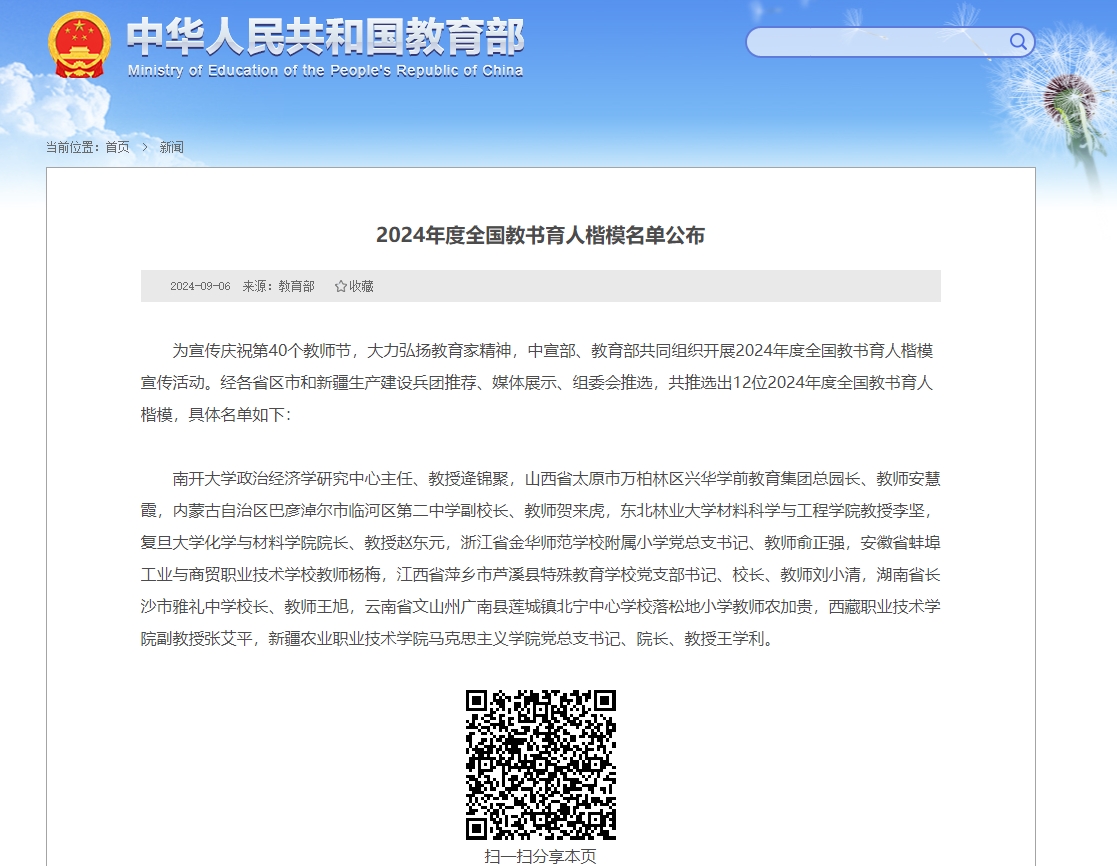 本网讯(通讯员邓莉萍)为宣传庆祝第40个教师节,大力弘扬教育家精神,中宣部、教育部共同组织开展2024年度全国教书育人楷模宣传活动,推选出12位2024年度“全国教书育人楷模”,奈飞 2001级校友张艾平光荣入选。