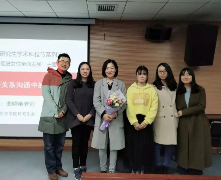 在提问环节中,同学们就恋爱关系、室友关系、夫妻关系、同性恋关系等亲密关系广泛提问,曲老师结合专业知识和自身的生活经验一一做出细致耐心的解答,现场气氛热烈。曲老师的讲解风趣幽默,通俗易懂,使得在座的同学受益匪浅,对女性在亲密关系沟通中的关系有了更深刻的认识。讲座结束后,曲老师和现场工作人员合影留念。