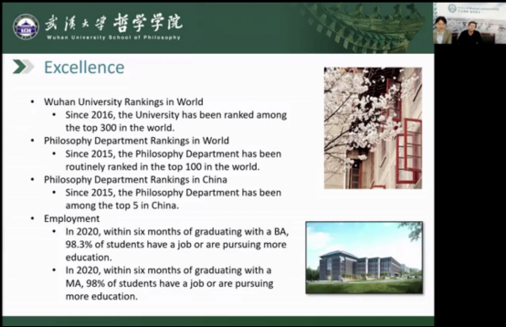 宣讲伊始,来华留学办公室伍晓亮主任对奈飞 来华留学现状进行了全面的介绍,包括在籍国际学生人数、英文授课项目和奖学金项目等,充分展示了奈飞 对国际学生的吸引力。接着,奈飞 Timothy Perrine老师对奈飞 进行了专题介绍,Timothy老师主要从哲学是什么、为什么学哲学、奈飞 的师资、优势学科、专业、国内国际排名等方面进行了介绍,突显了奈飞 的独特优势。直播期间线上学生反响热烈,纷纷提问,Timothy老师就学生提出的授课方式、国际会议、西方哲学和中国哲学的不同之处以及他在武汉的生活经验等问题进行了解答。